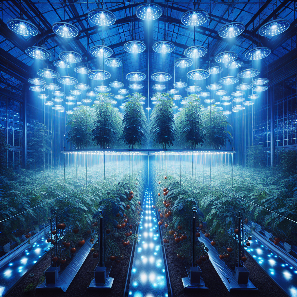 🔍 Dowód wizualny: Zdjęcie przedstawia sekcję szklarni z pomidorami oświetlonymi niebieskimi lampami LED, co ma na celu zwiększenie efektywności fotosyntezy.