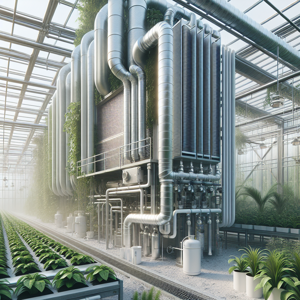 🔍 Dowód wizualny: Zdjęcie przedstawiające nowoczesny system filtracji powietrza w szklarni, z widocznymi rurami i filtrami powietrza