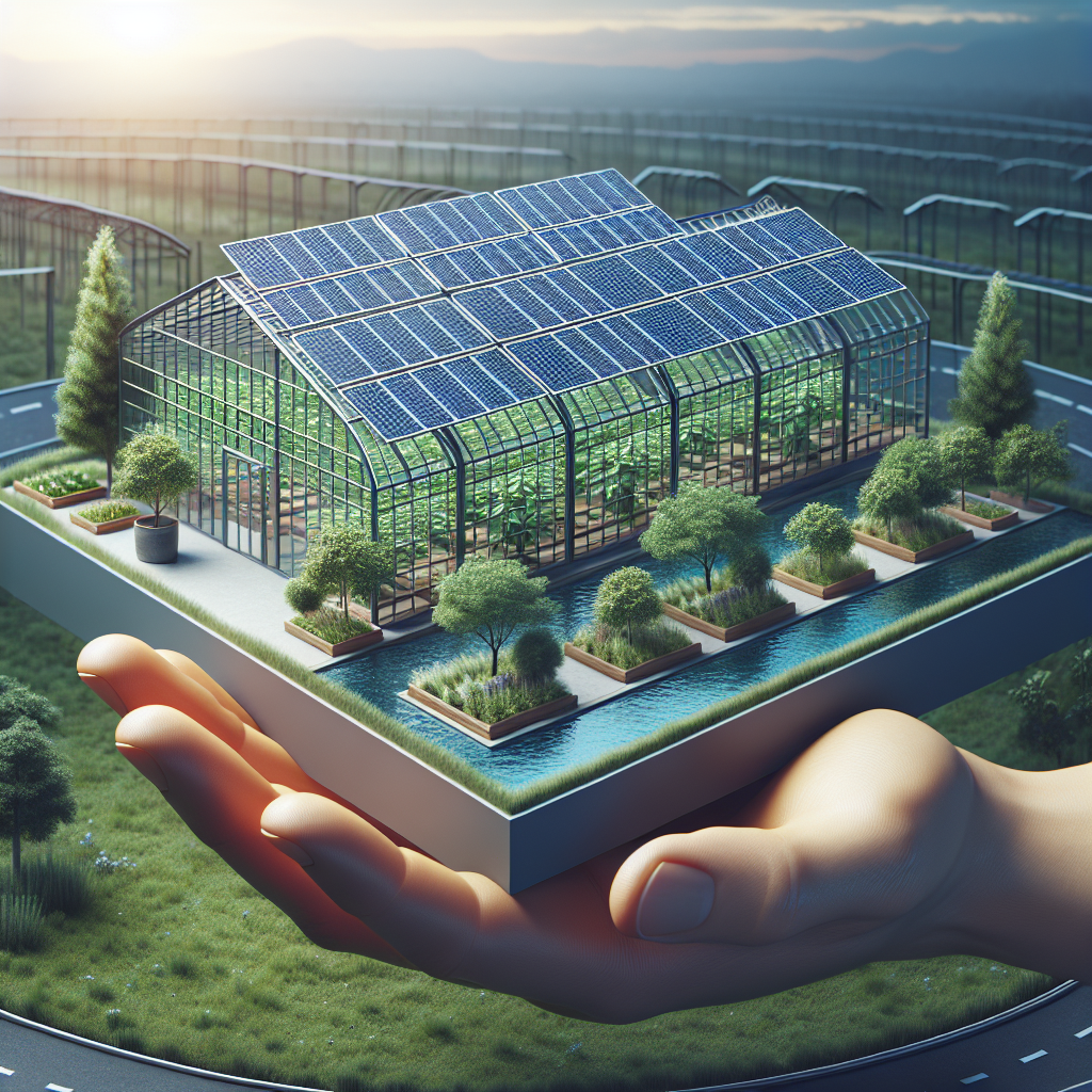 🔍 Dowód wizualny: Zdjęcie przedstawia nowoczesną szklarnię z panelami słonecznymi na dachu, co ilustruje zastosowanie odnawialnych źródeł energii w rolnictwie.