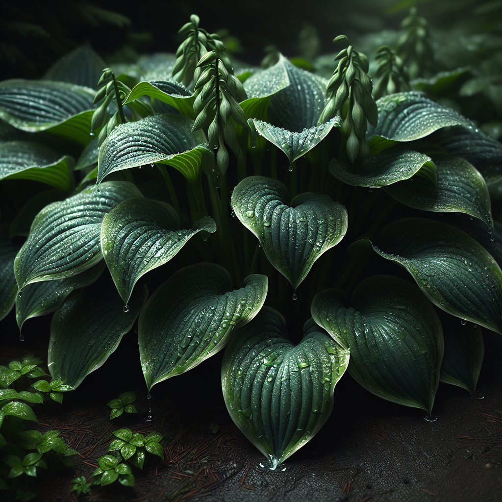 🔍 Dowód wizualny: Zdjęcie hosty z dużymi, zielonymi liśćmi pokrytymi kroplami wody, rosnącej w cieniu. - Brunnera wielkolistna – znana również jako niezapominajka ogrodowa, jest rośliną cieniolubną, której niebieskie kwiaty są pięknym akcentem na tle zieleni.