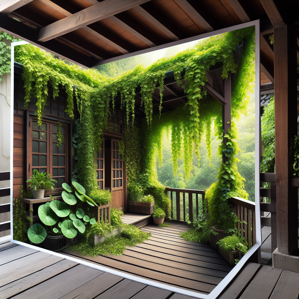 🔍 Dowód wizualny: Zdjęcie przedstawia bujne, zielone liście bluszczu pnącego się po drewnianej kratownicy na zacienionym balkonie. - Funkia (Hosta) – Funkie są znane z pięknych liści w różnych odcieniach zieleni, żółci i niebieskiego. Doskonale rosną w miejscach zacienionych, a ich liście dodają tekstury do ogrodu.