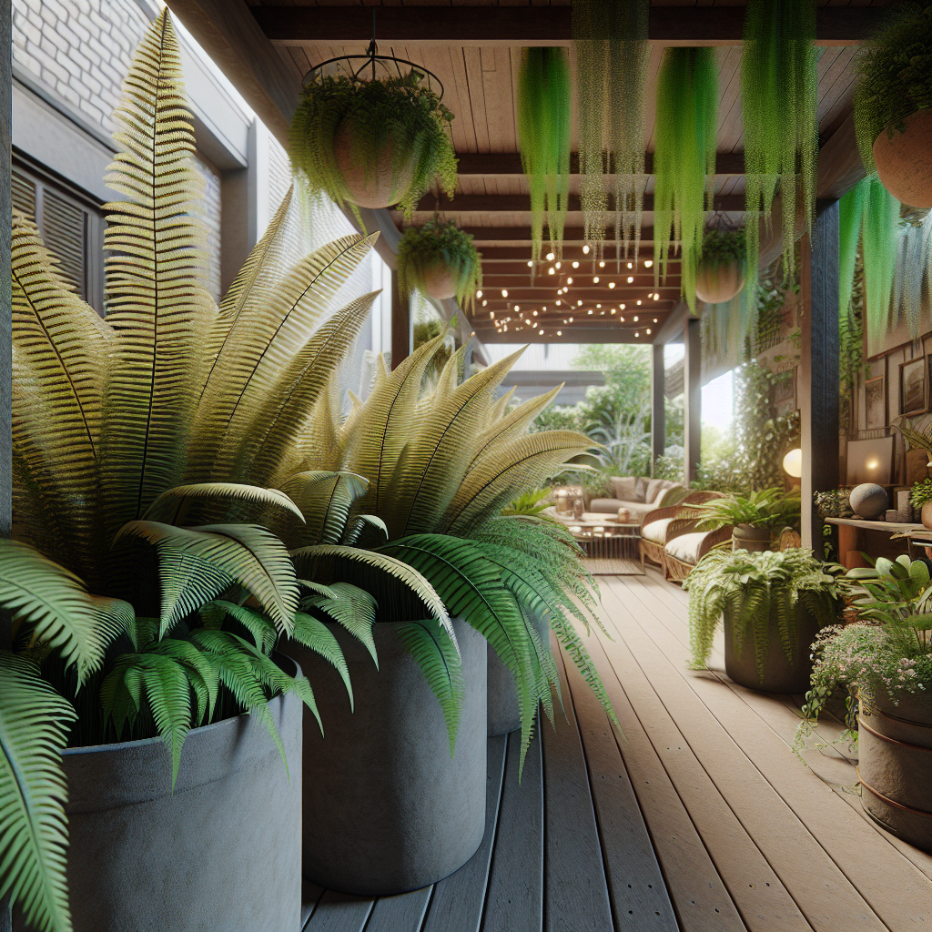 🔍 Dowód wizualny: Zdjęcie przedstawia grupę bujnych paproci rosnących w dużych donicach na zacienionym balkonie.