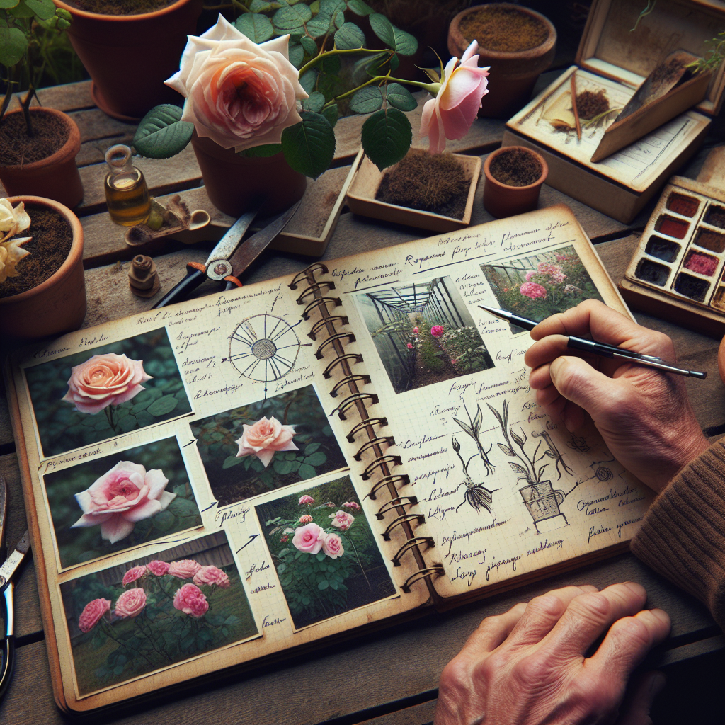 🔍 Dowód wizualny: notatnik ogrodniczy z zapiskami i zdjęciami róż z różnymi objawami - Testowanie rozwiązań: Po zidentyfikowaniu problemu i przygotowaniu narzędzi, czas na testowanie rozwiązań. Dla problemów z liśćmi, może to oznaczać zastosowanie nawozu bogatego w azot. Jeśli mamy do czynienia z infekcją grzybiczą, konieczne będzie użycie odpowiedniego fungicydu.