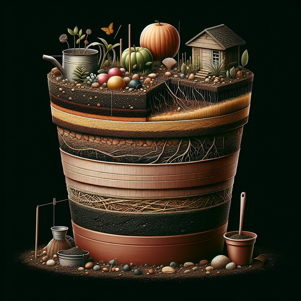 Na fotografii widać różne warstwy ziemi i drenażu, co wskazuje na skomplikowany proces przygotowania podłoża, który różni się w zależności od rodzaju warzywa.